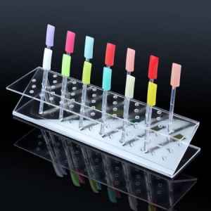 Wzornik na 64 tipsy dzięki swojemu kształtowi pozwala na wygodną, piętrową ekspozycję kolorów, ozdób do paznokci i gotowych stylizacji. Wykonany z przezroczystego pleksi, estetyczny i funkcjonalny, ma 5 poziomów i zawiera 64 szpadki zakończone tipsami clear w kształcie prostokątnym.