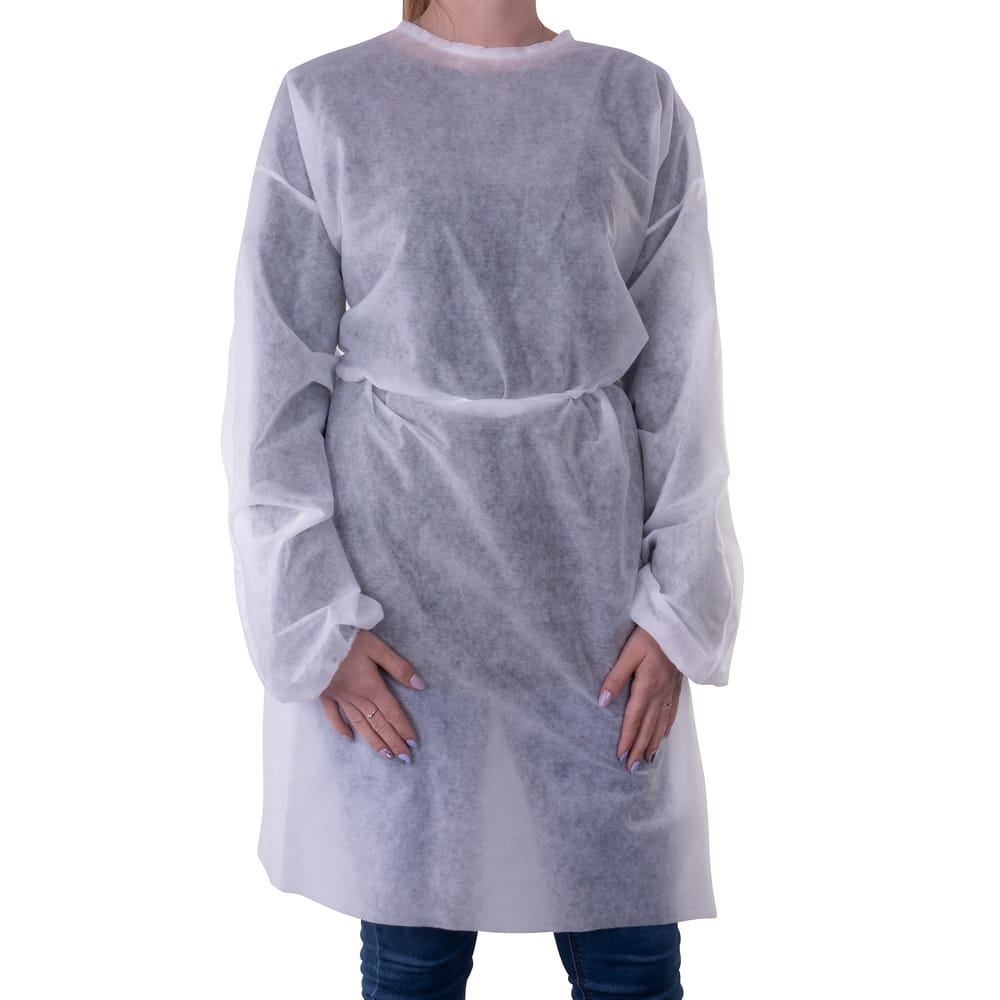 Fartuch ochronny włókninowy w kolorze białym (zdjęcie tylko poglądowe), doskonały do ochrony personelu i pacjentów szpitala, a także jego gości. Wysoka jakość wykonania pozwala na skuteczne zabezpieczenie przed materiałem biologicznym i innymi zagrożeniami.