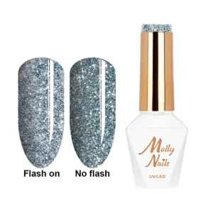 Flashing Lights. To właśnie od światła wszystko się zaczyna… I na świetle kończy! Kolekcja wysublimowanych barw od Molly Nails skrywa w sobie dwie twarze. Pierwsza z nich to przydymiona wersja koloru z delikatnym gwiezdnym pyłem, druga z nich z kolei ukazuje miliony roziskrzonych srebrzystych drobinek skąpanych w pięknych kolorach. To, która wersja będzie widoczna, zależy tylko od światła i jego natężenia!