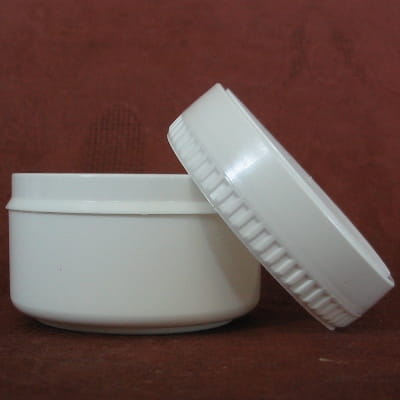 Plastikowy pojemnik farmaceutyczny z przykrywką o pojemności 50 ml.
