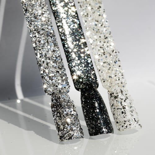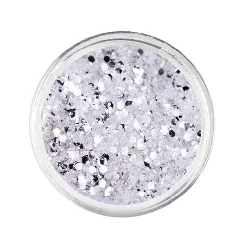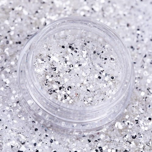 Niepowtarzalny, srebrzysty blask niczym księżycowy pył! Unikalna ozdoba w oryginalnej formie szronu! Pół transparentny odcień grubych i brokatowych drobin srebra i bieli połączone w intrygujący mix! Lustrzane drobiny przyciągną wzrok.