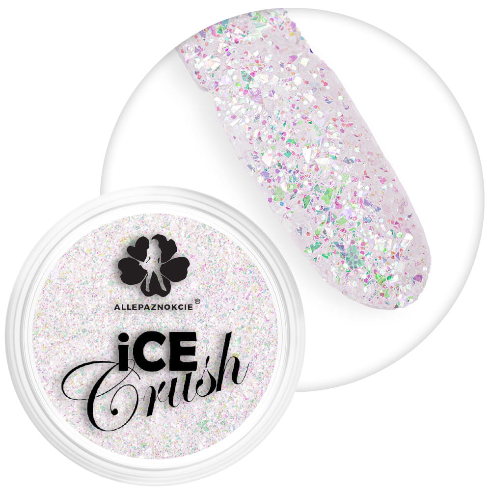 Ice crush - mieniący się manicure w ciekawej fakturze! Twój sposób na olśniewający look w wielowymiarowej formie - połączenie kilku rozmiarów i kształtów opalizujących drobin brokatowych. Produkt pozwala na wykonanie wielu zdobień - od zatapiania w stylu princess nails, poprzez mieszanie z żelem i tworzenie swoich kreatywnych produktów budujących, aż do posypywania co da oszronioną powierzchnię.