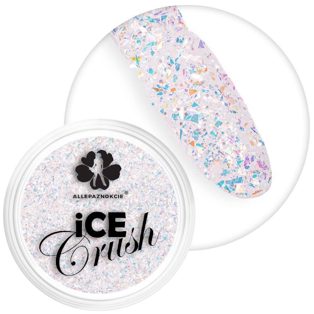 Ice crush - mieniący się manicure w ciekawej fakturze! Twój sposób na olśniewający look w wielowymiarowej formie - połączenie kilku rozmiarów i kształtów opalizujących drobin brokatowych. Produkt pozwala na wykonanie wielu zdobień - od zatapiania w stylu princess nails, poprzez mieszanie z żelem i tworzenie swoich kreatywnych produktów budujących, aż do posypywania co da oszronioną powierzchnię.