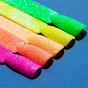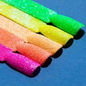 Brokaty Lucid Punch unikalnie zmieniają opalizującą barwę w zależności od kąta padania światła. Szczególnie mocno błyszczą w świetle sztucznym i UV. Zmieniaj rodzaj uzyskanego efektu i fakturę w zależności od ilości użytego produktu a także poziom wybicia neonu od koloru podkładowego.