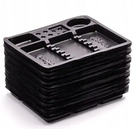 - Posiadają specjalne przegródki, wgłębienia na wszelakiego rodzaju płyny, materiały, które po każdym kliencie zostają od razu wyrzucone z tacką.