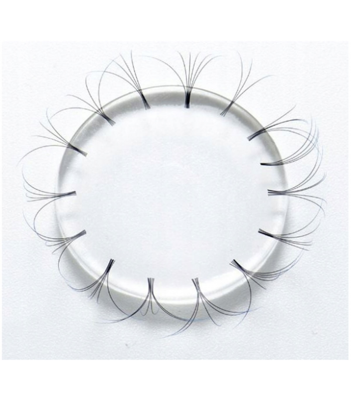 Pożądaną ilość rzęs należy umieścić na kropce i delikatnie wcisnąć. Utworzony wachlarzyk należy zdjąć pęsetą do metod objętościowych. Produkt nie jest pokryty powłoką, która mogłaby zostawać na kępce.
